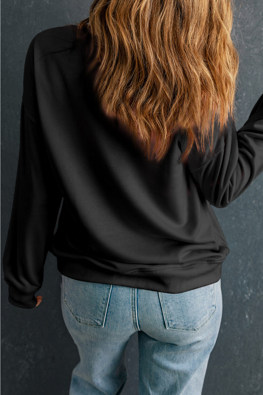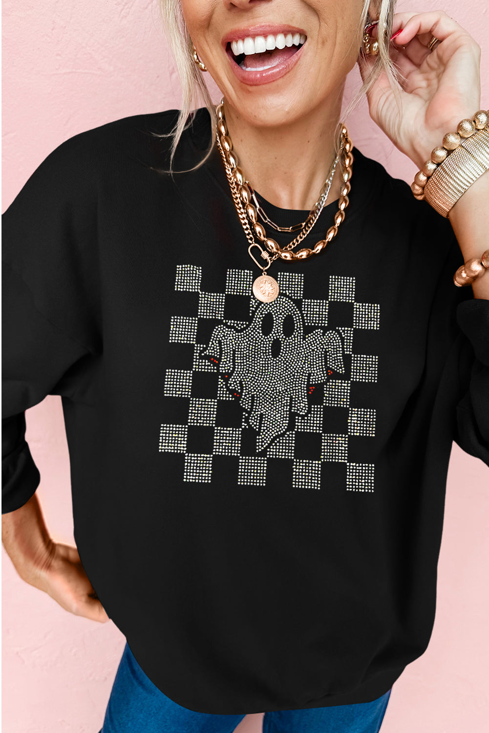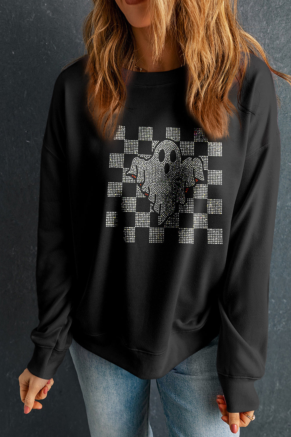 Black Rhinestone Checkered Halloween Ghost Drop Shoulder Sweatshirt