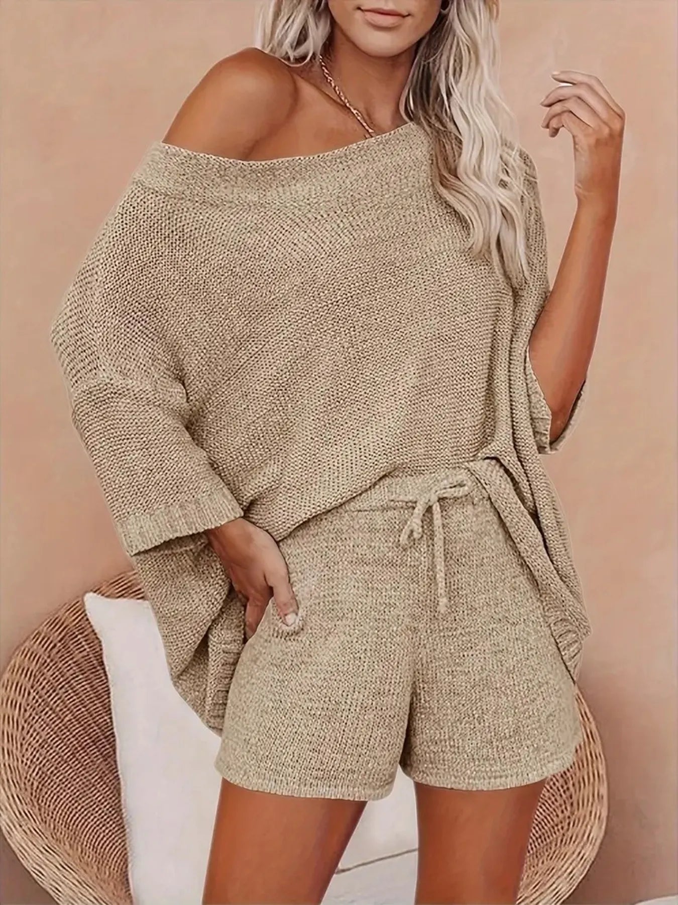 Boat Neck Oversize Top and Shorts Sweater Set