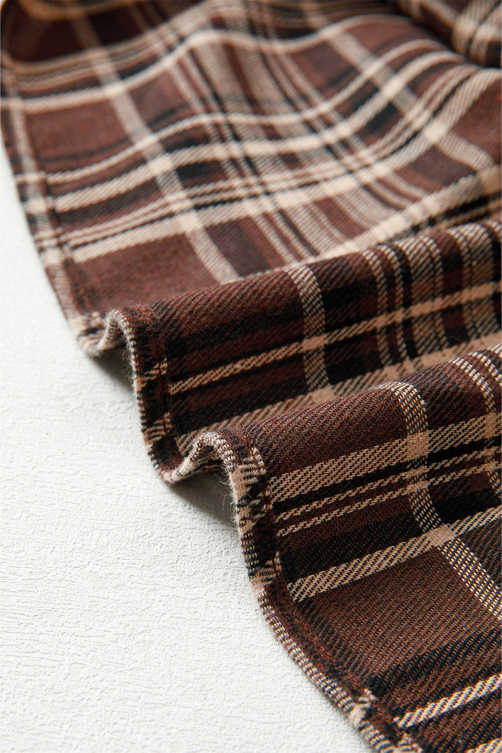 Brown Plaid Waffle Patchwork Henley Hoodie – Cozy Long Sleeve Top for Women
