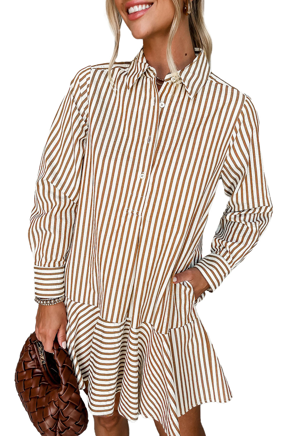Brown Stripe Ruffle Hem Collared Long Sleeve Shirt Mini Dress