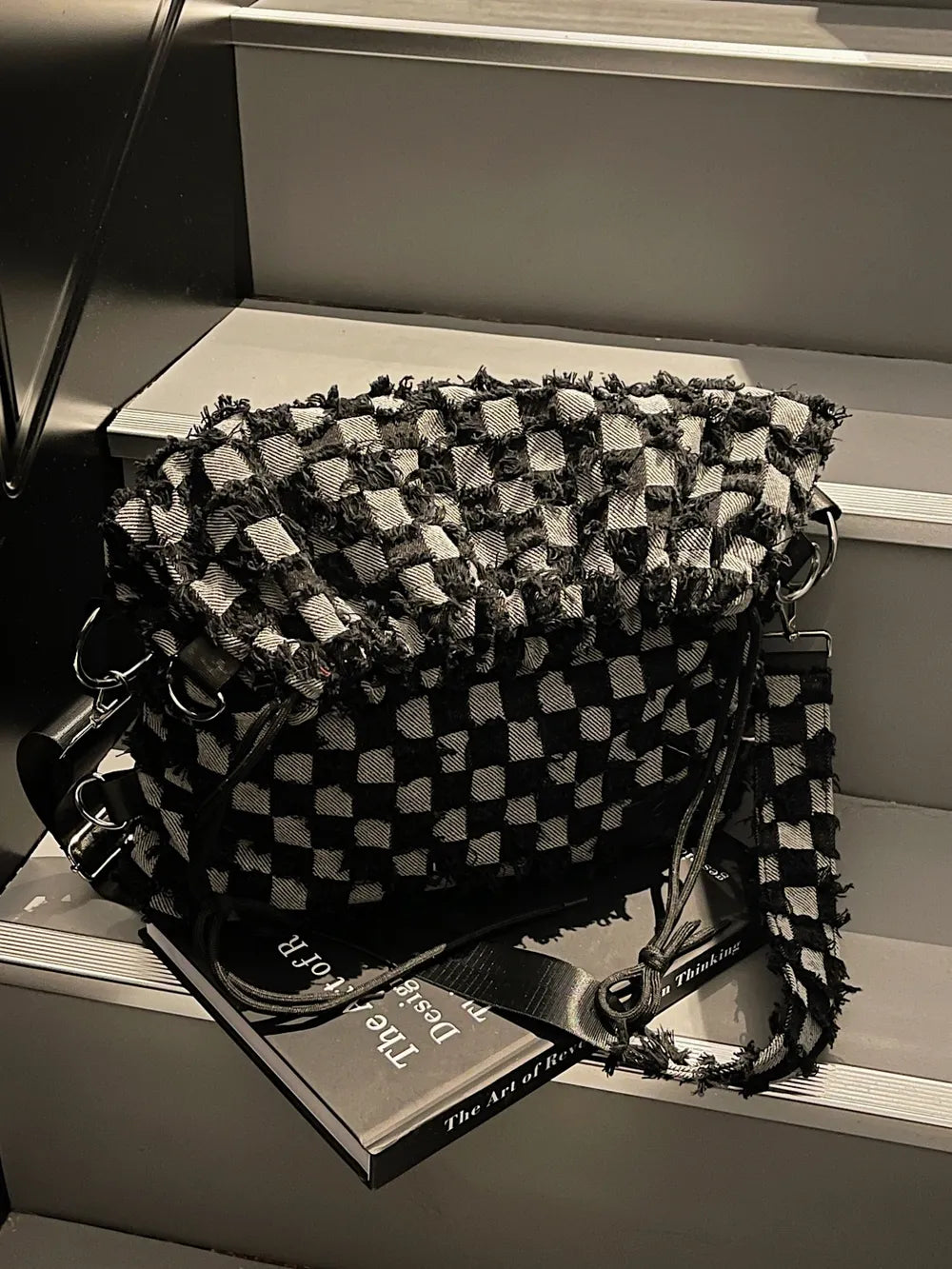 Checkered Raw Edge Adjustable Strap Convertible Bag