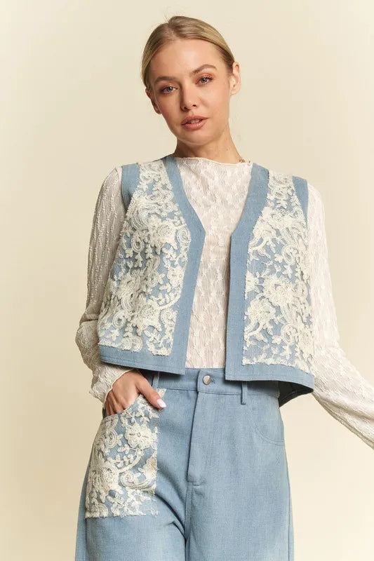 Davi & Dani Lace Patch Open Front Denim Vest