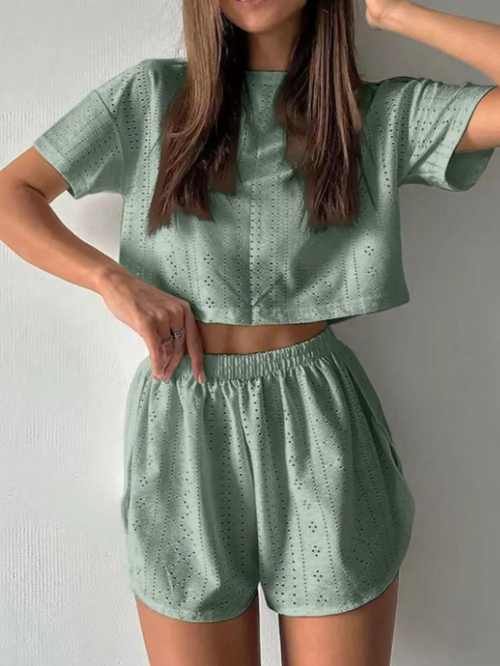 Eyelet Round Neck Top and Shorts Set