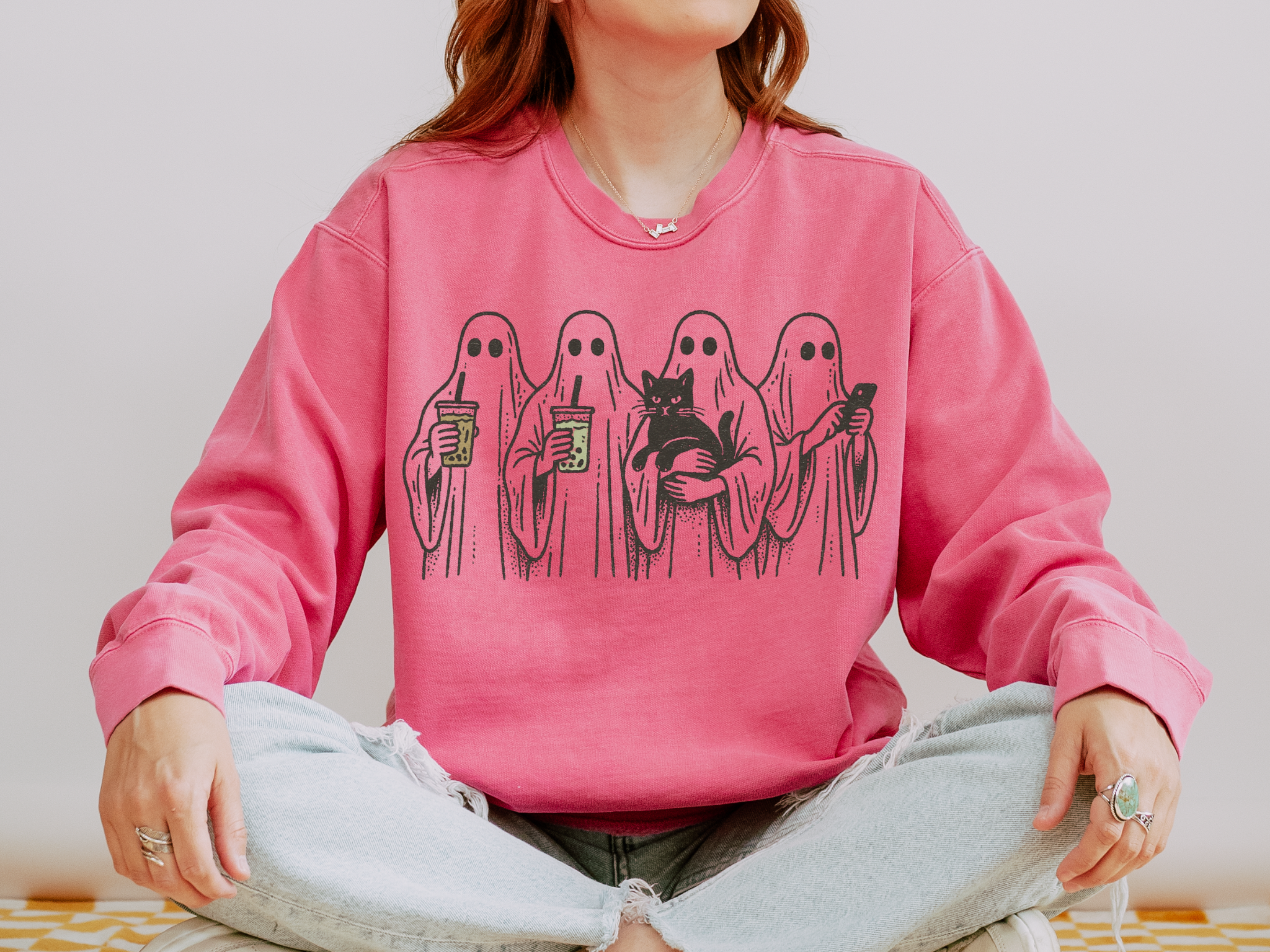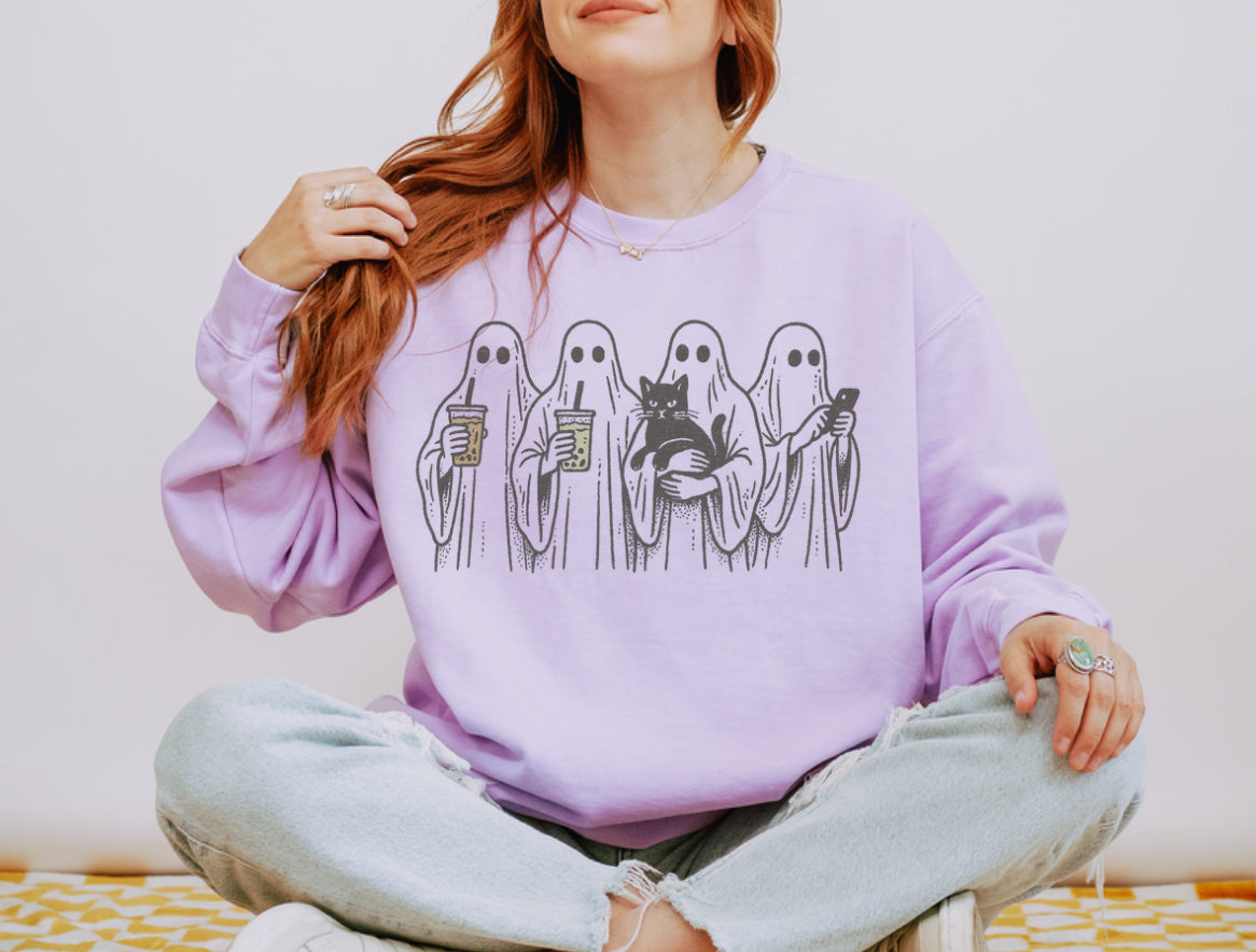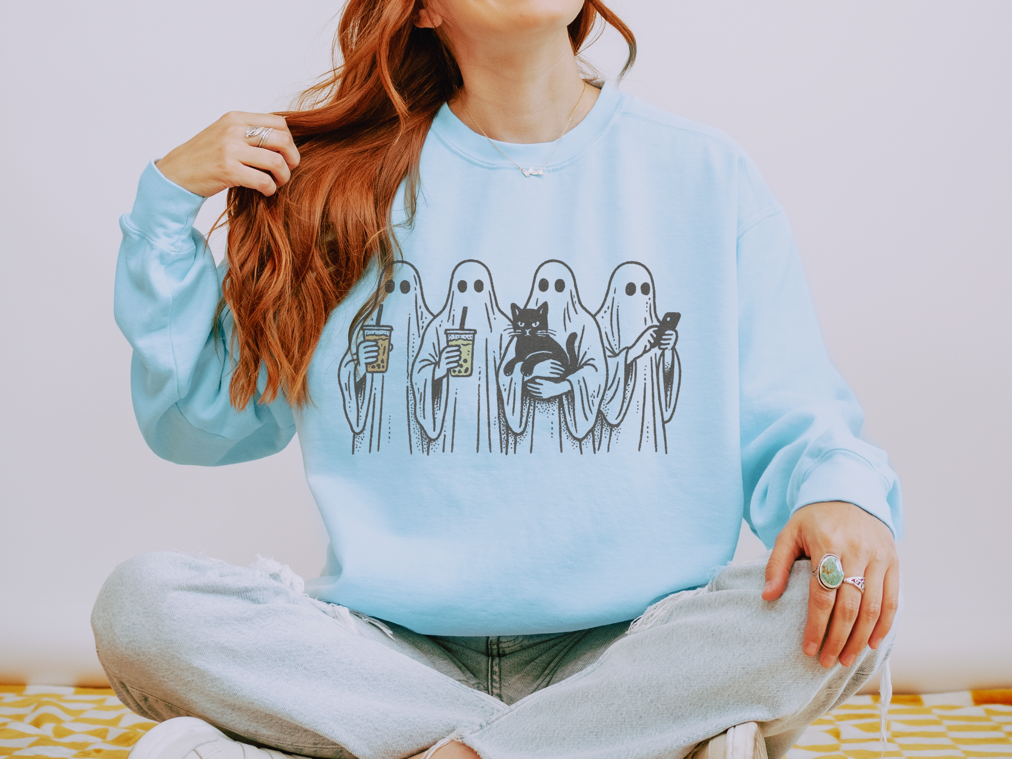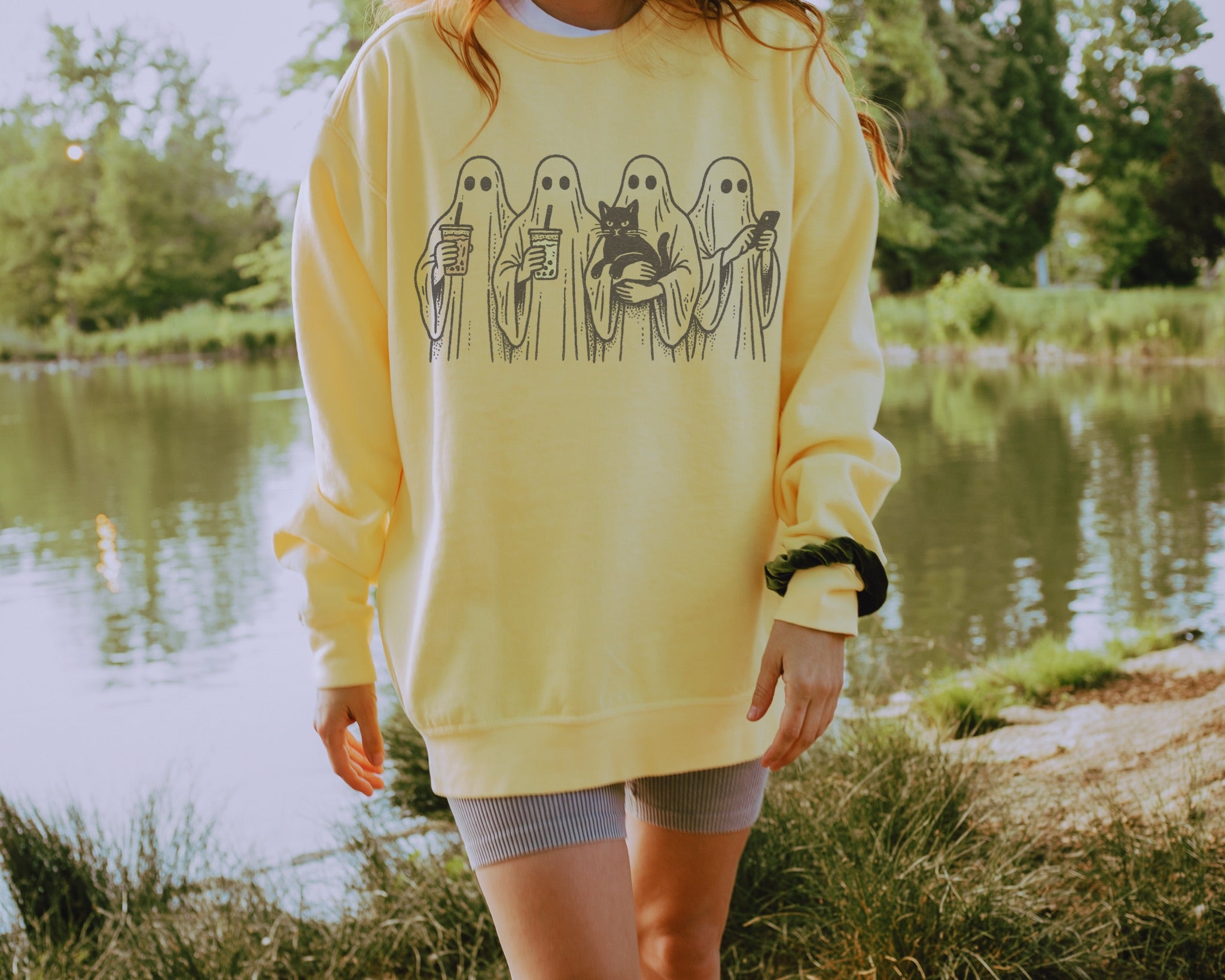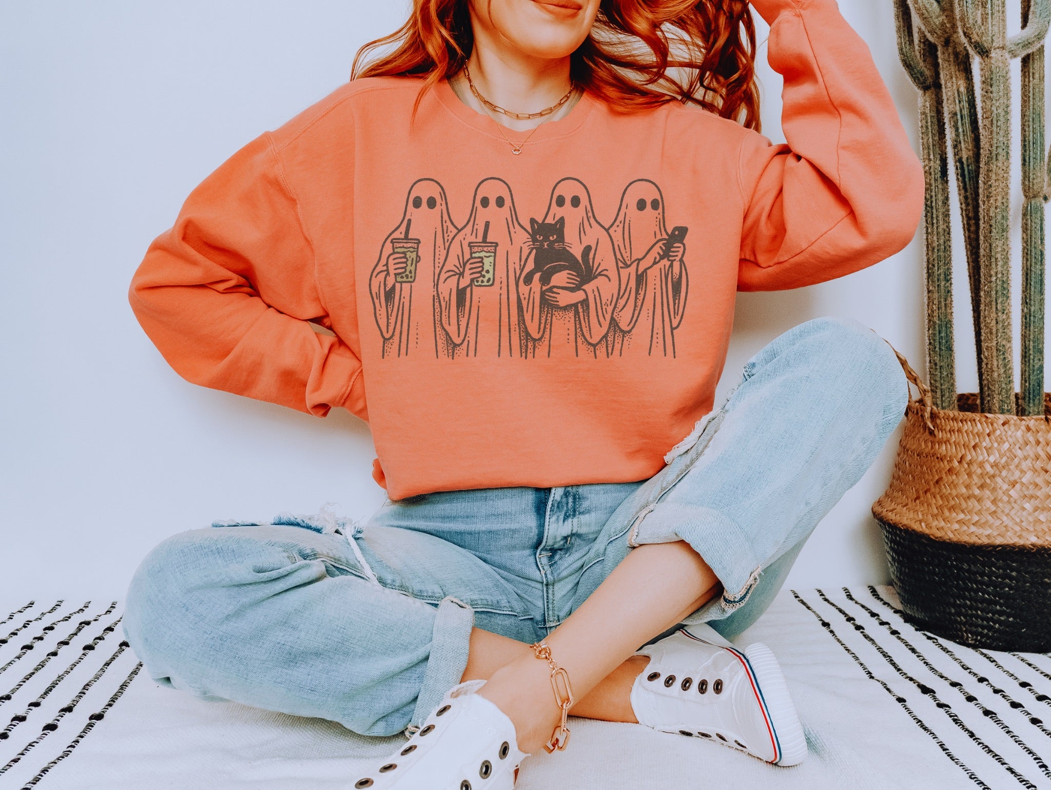 Stay cozy and spooky with our Ghost Squad Halloween sweatshirt šŸ‘»ā˜•šŸˆ. Featuring four trendy ghosts holding coffee, a black cat, and a phone, this oversized crewneck is perfect for pumpkin patch trips, haunted hangouts, or lounging with your iced latte.
