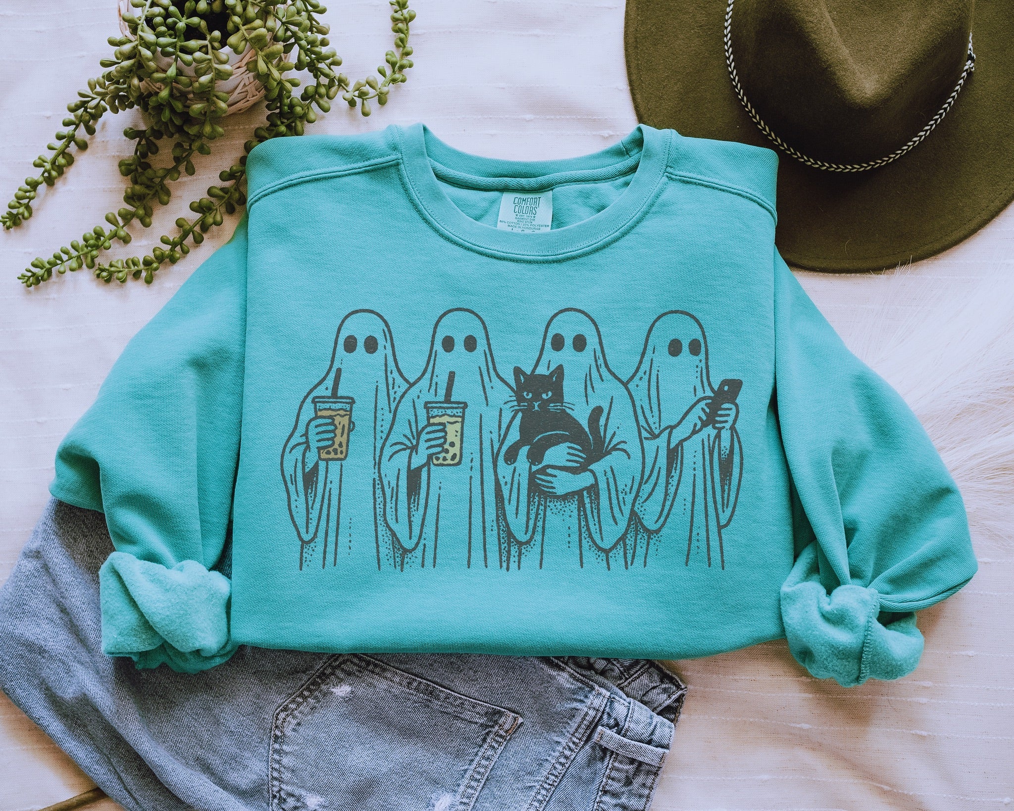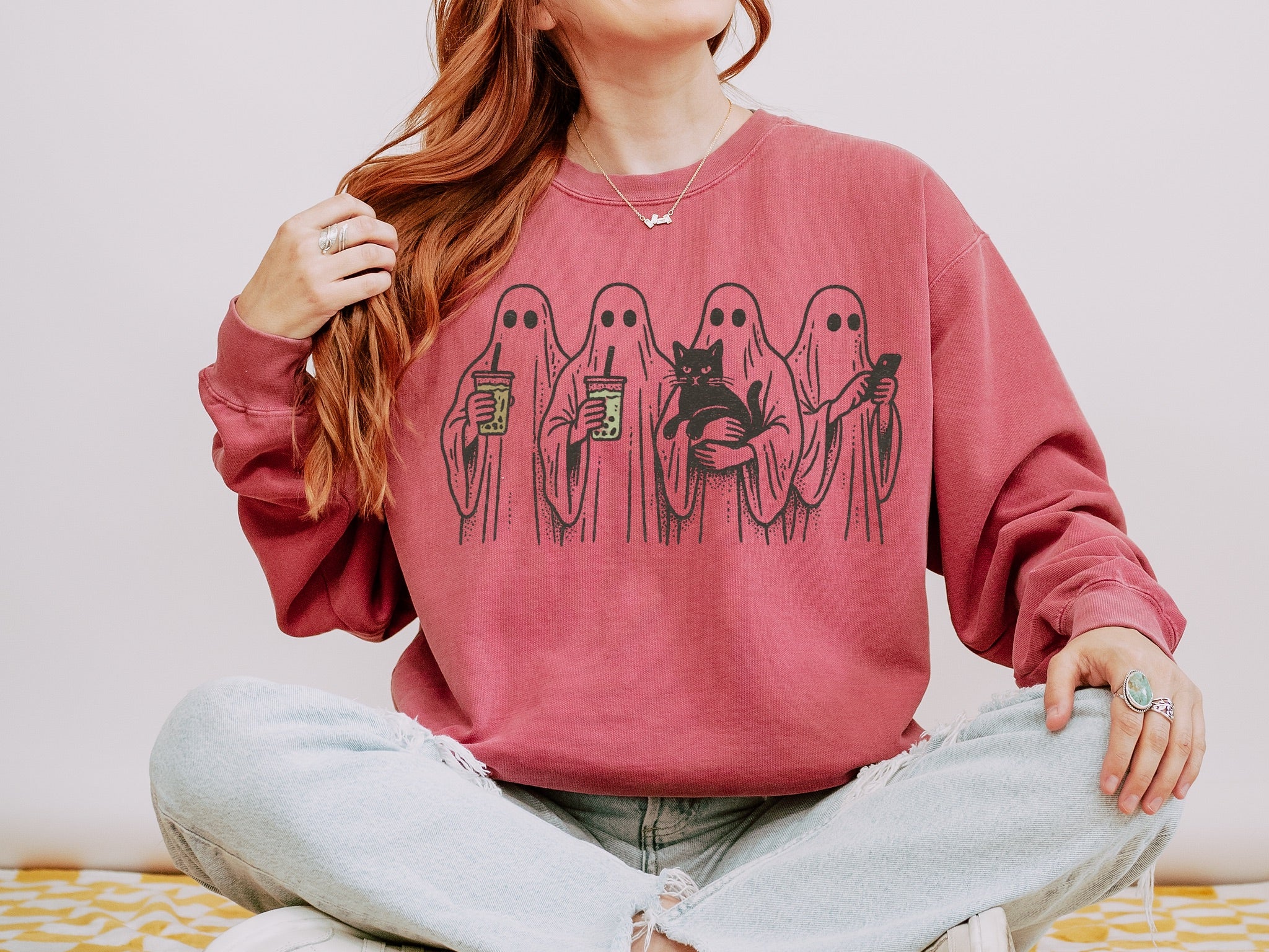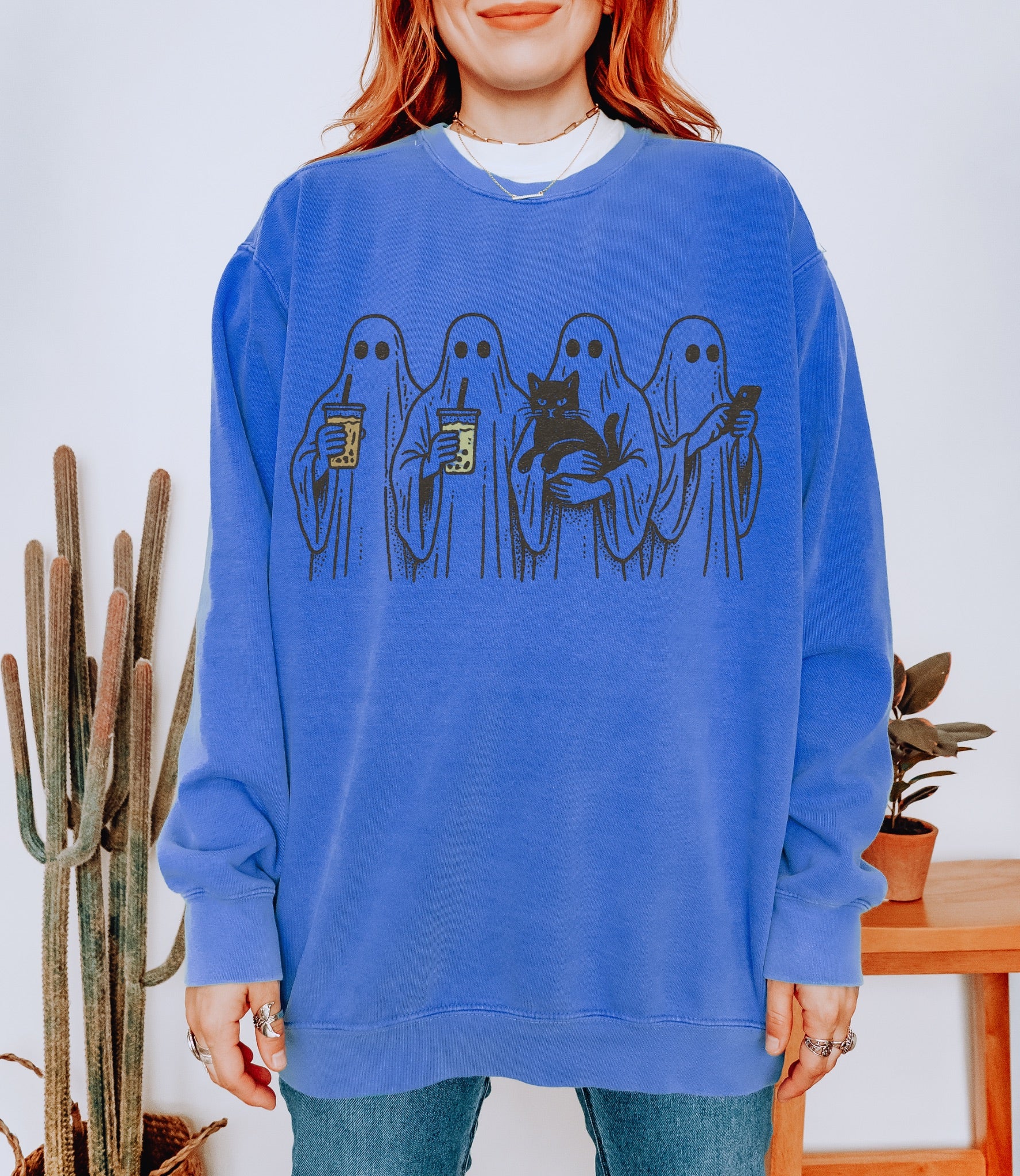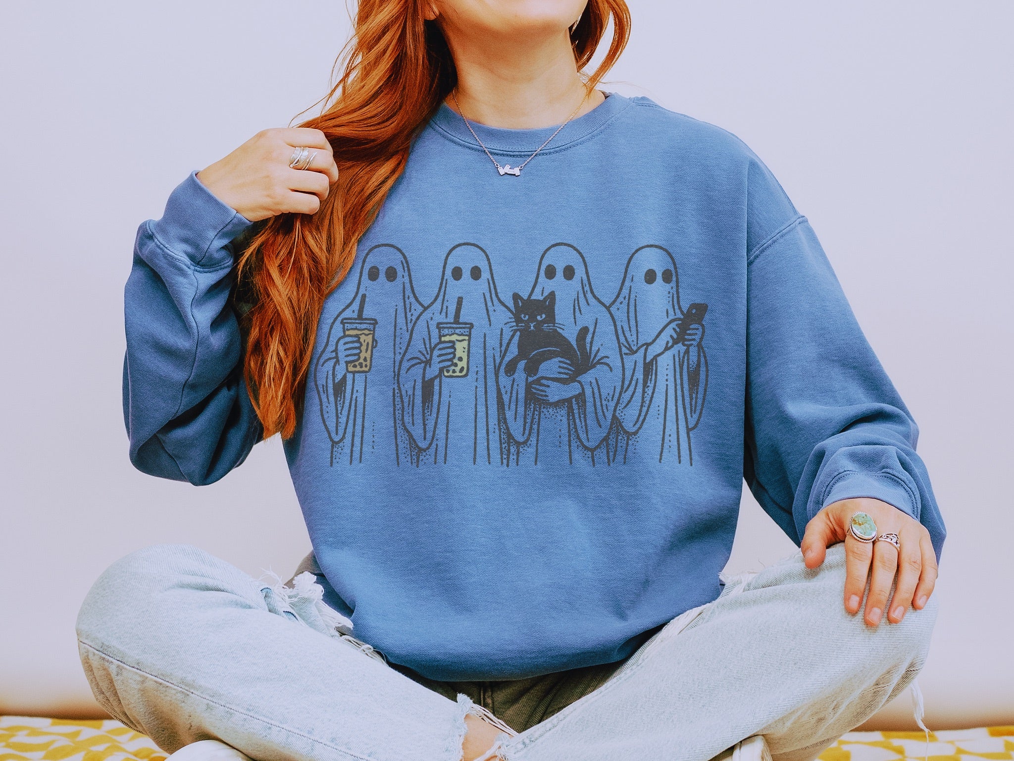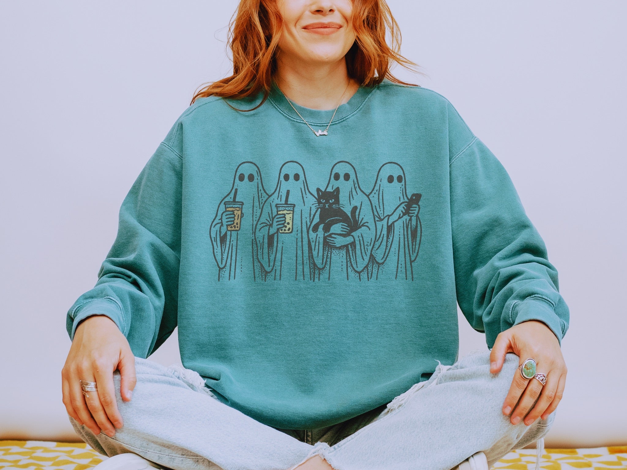 Stay cozy and spooky with our Ghost Squad Halloween sweatshirt šŸ‘»ā˜•šŸˆ. Featuring four trendy ghosts holding coffee, a black cat, and a phone, this oversized crewneck is perfect for pumpkin patch trips, haunted hangouts, or lounging with your iced latte.