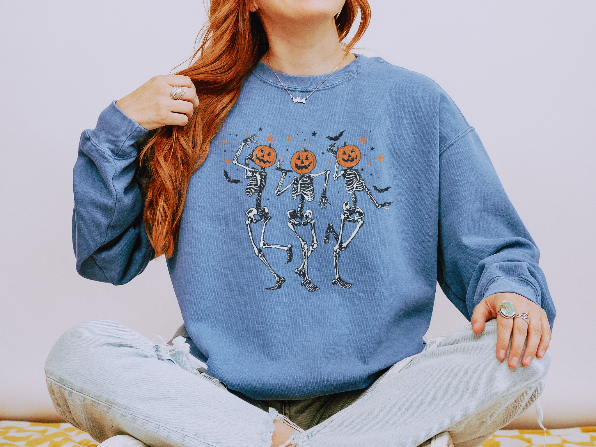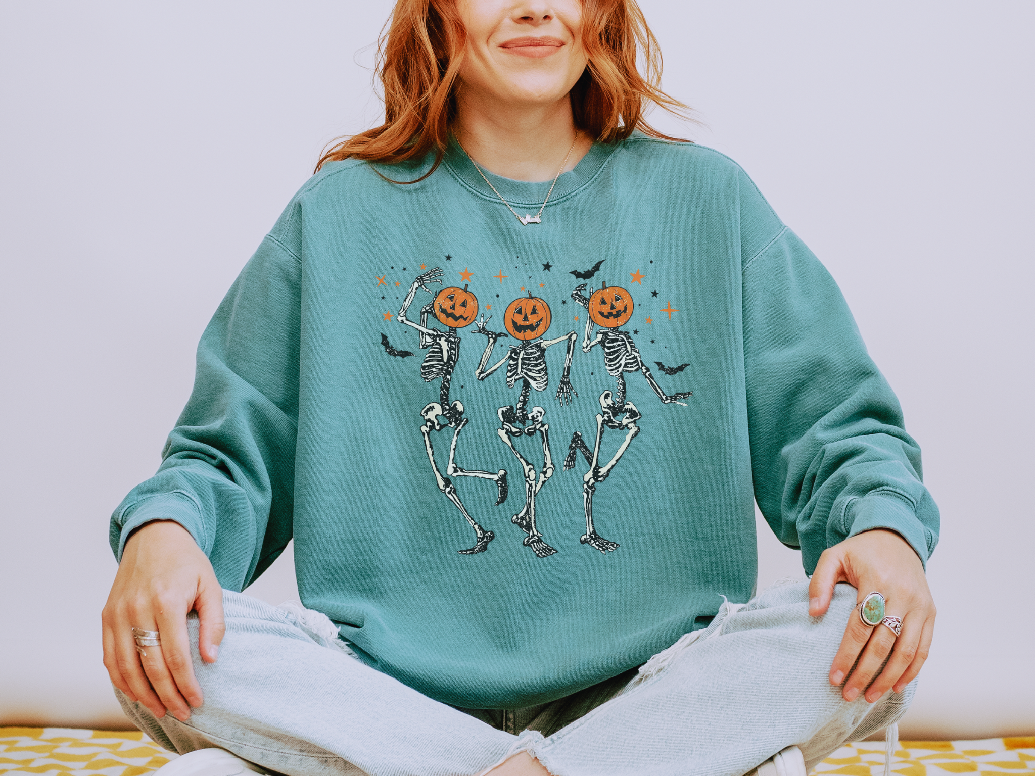 Halloween Skeleton Sweatshirt, Unisex Garment-Dyed Crewneck, Spooky Fall Fashion, Pumpkin Design, Cozy Halloween Apparel