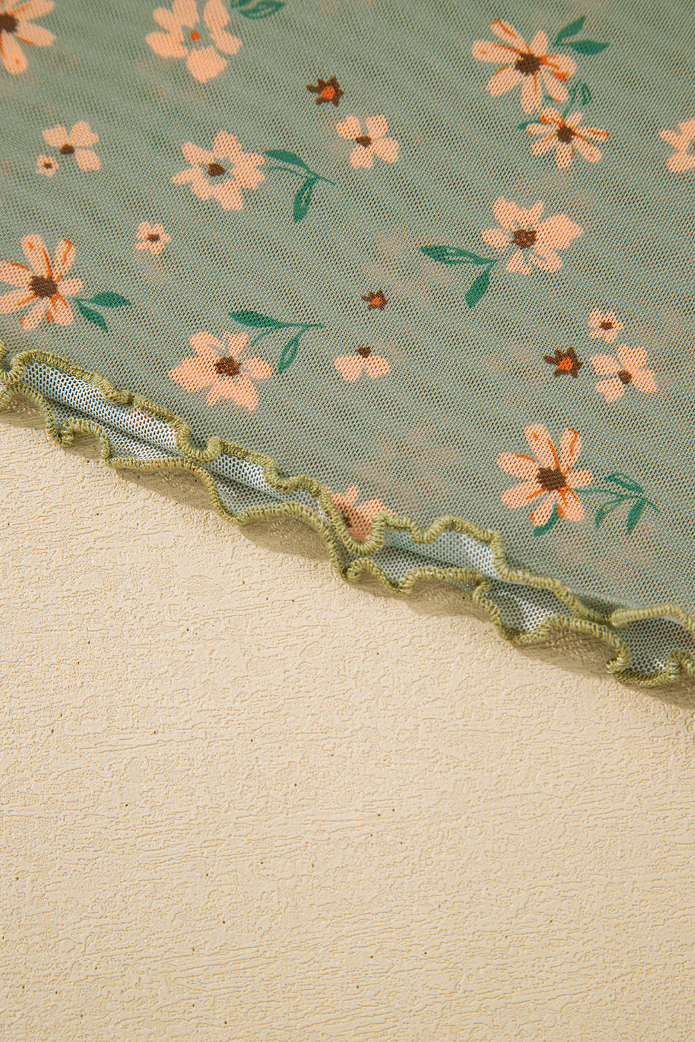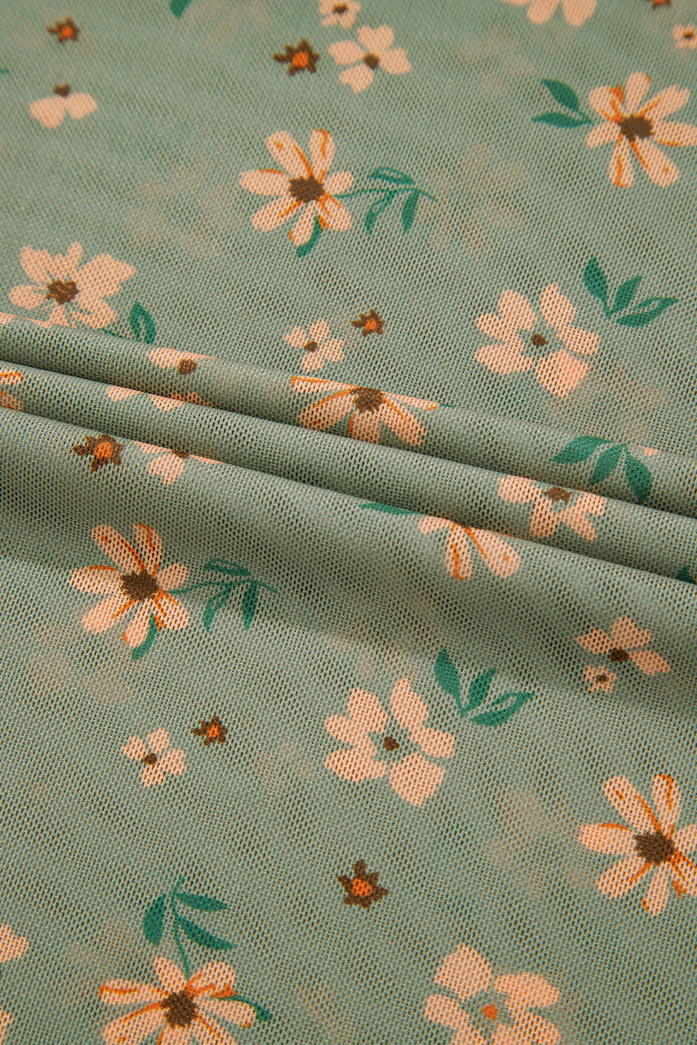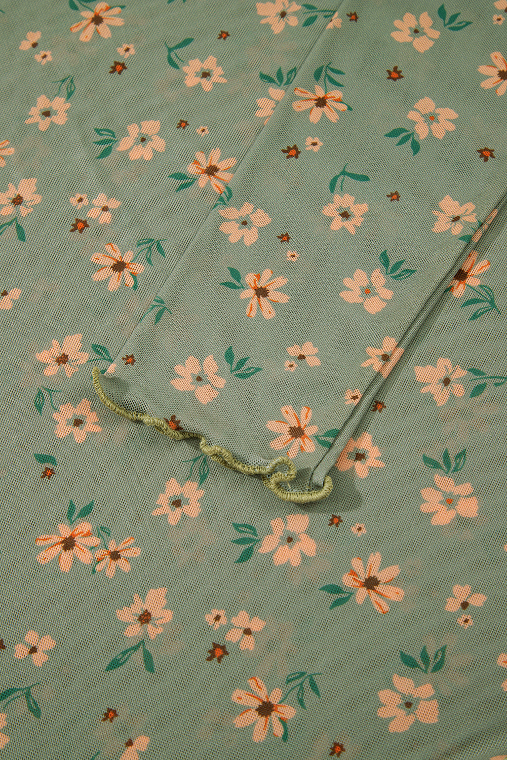 Laurel Green Vintage Floral Print Mesh Slim Fit Long Sleeve Top