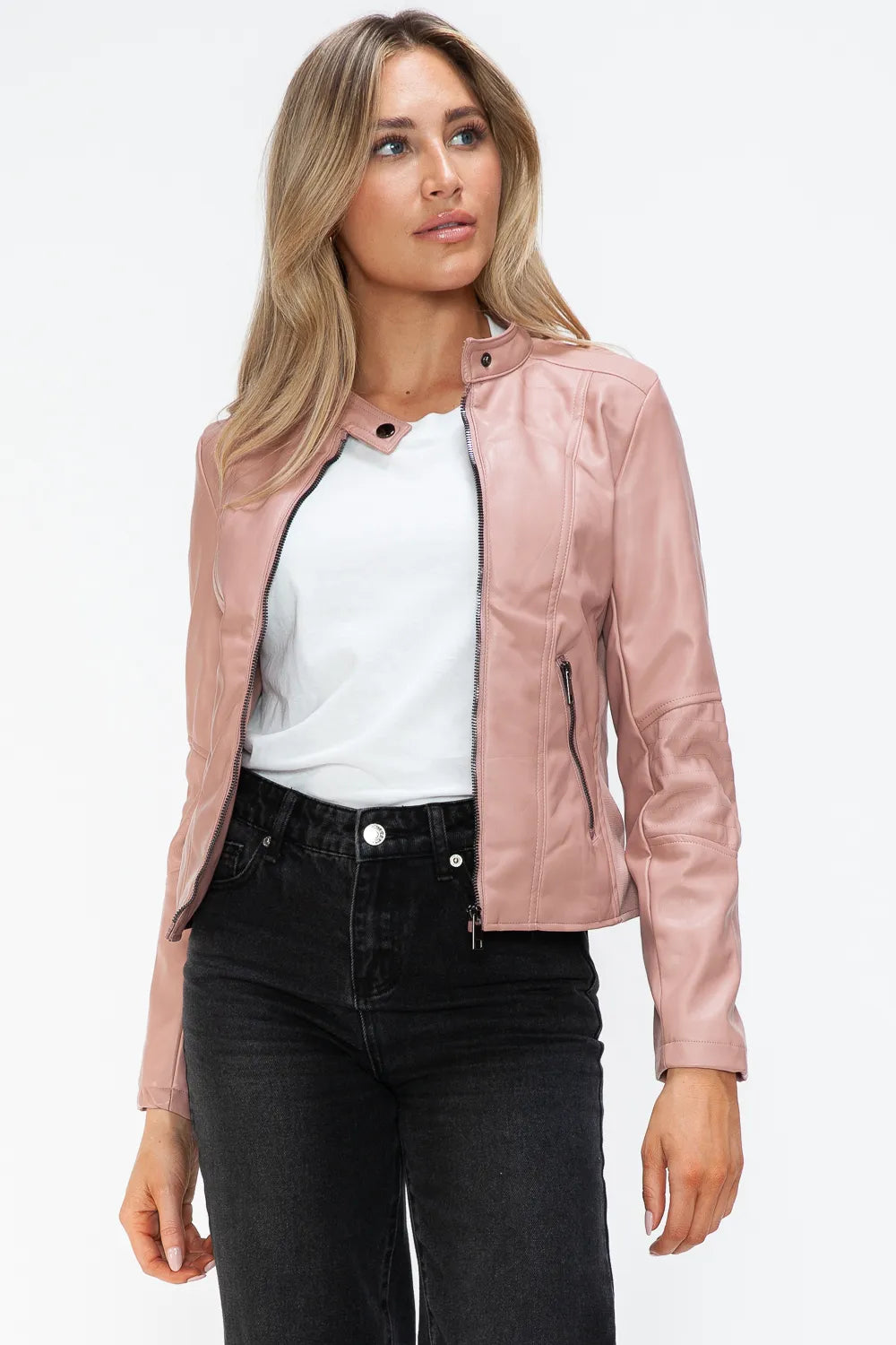 Snobbish Faux Leather Zip Up Drawstring Hooded Jacket