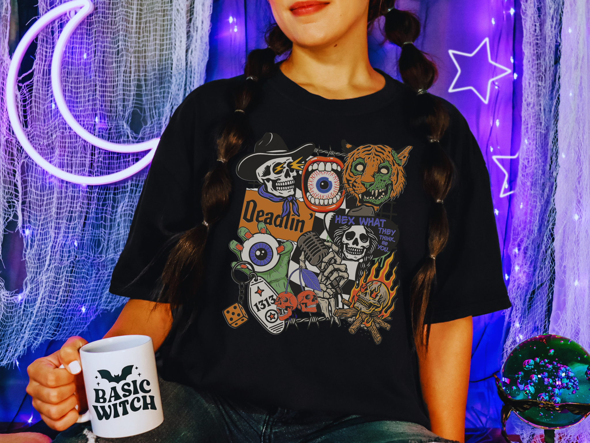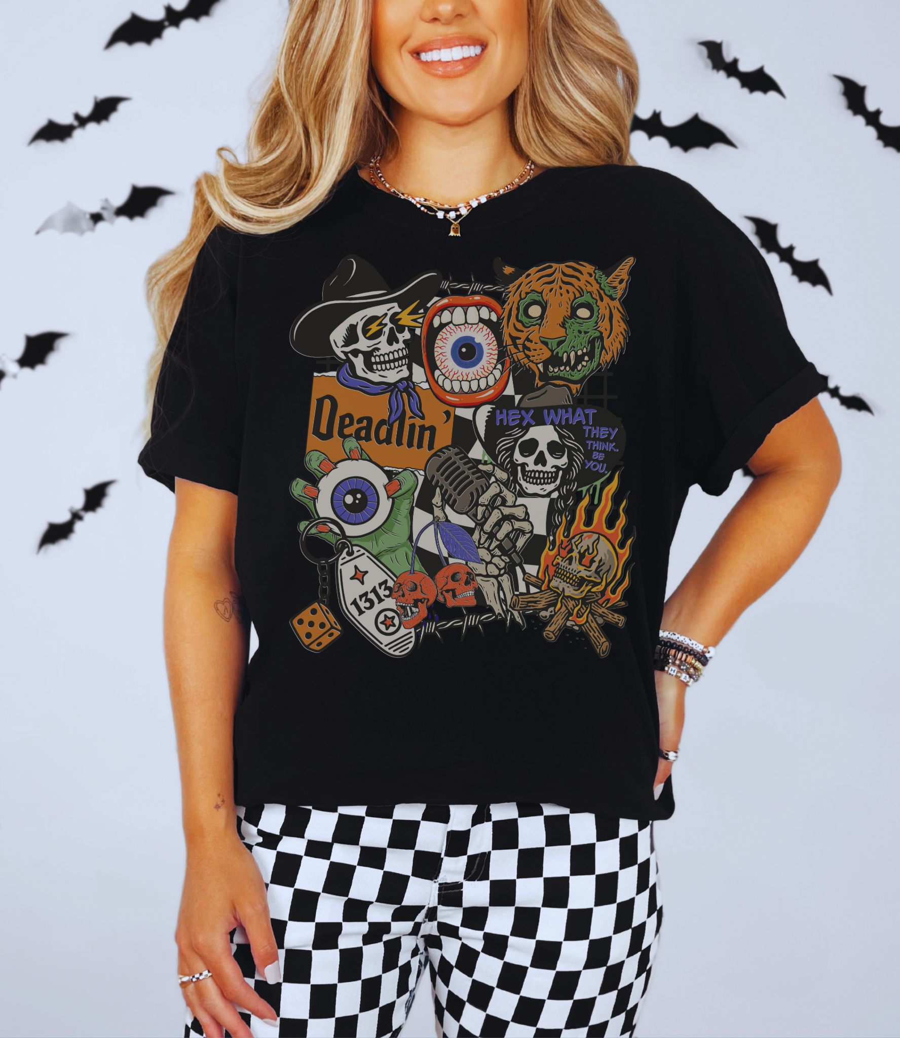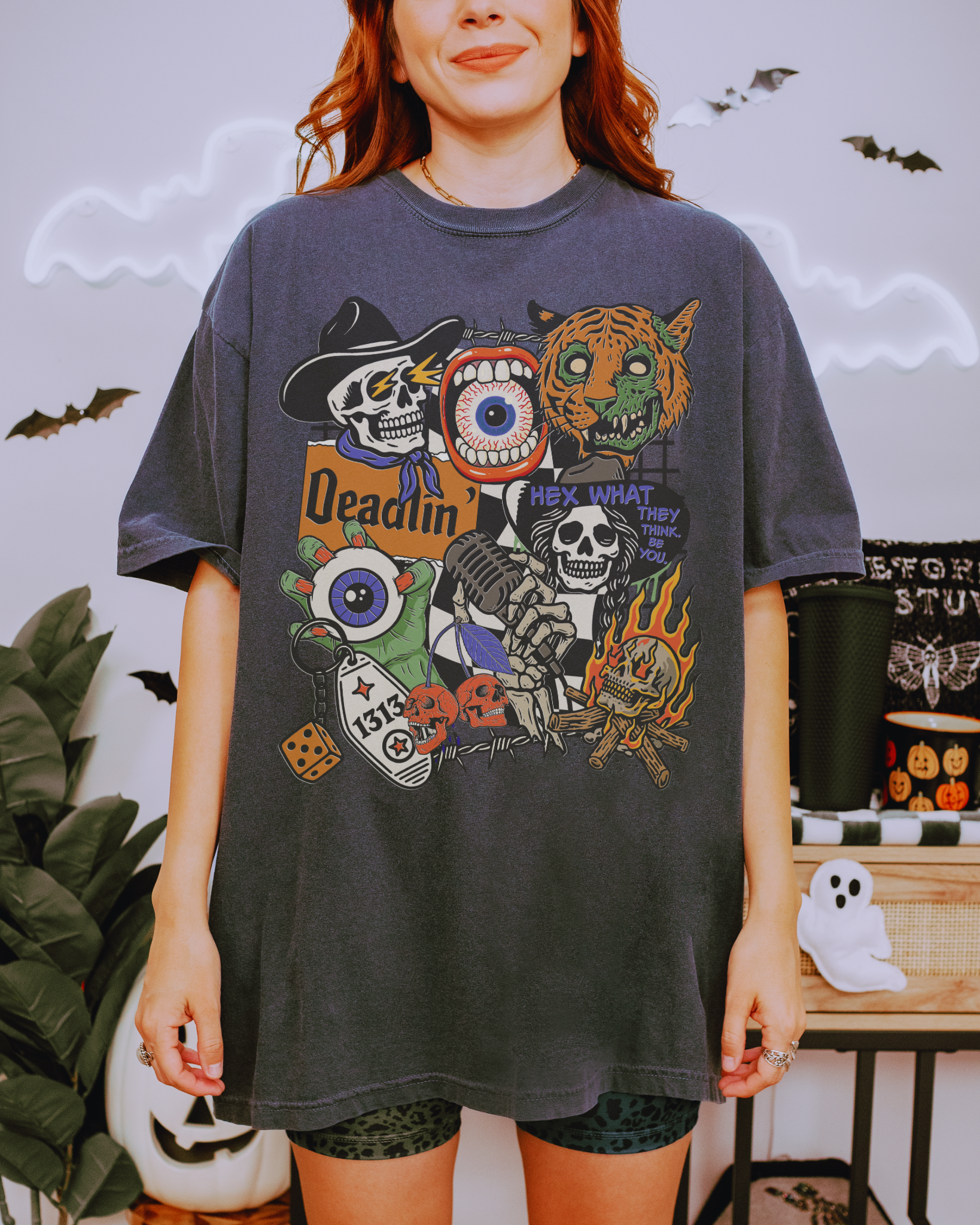 Spooky Retro Halloween Graphic Tee â Witchy Goth T-Shirt with Skeletons, Tiger, Eyeball & Flames | Vintage Horror Aesthetic