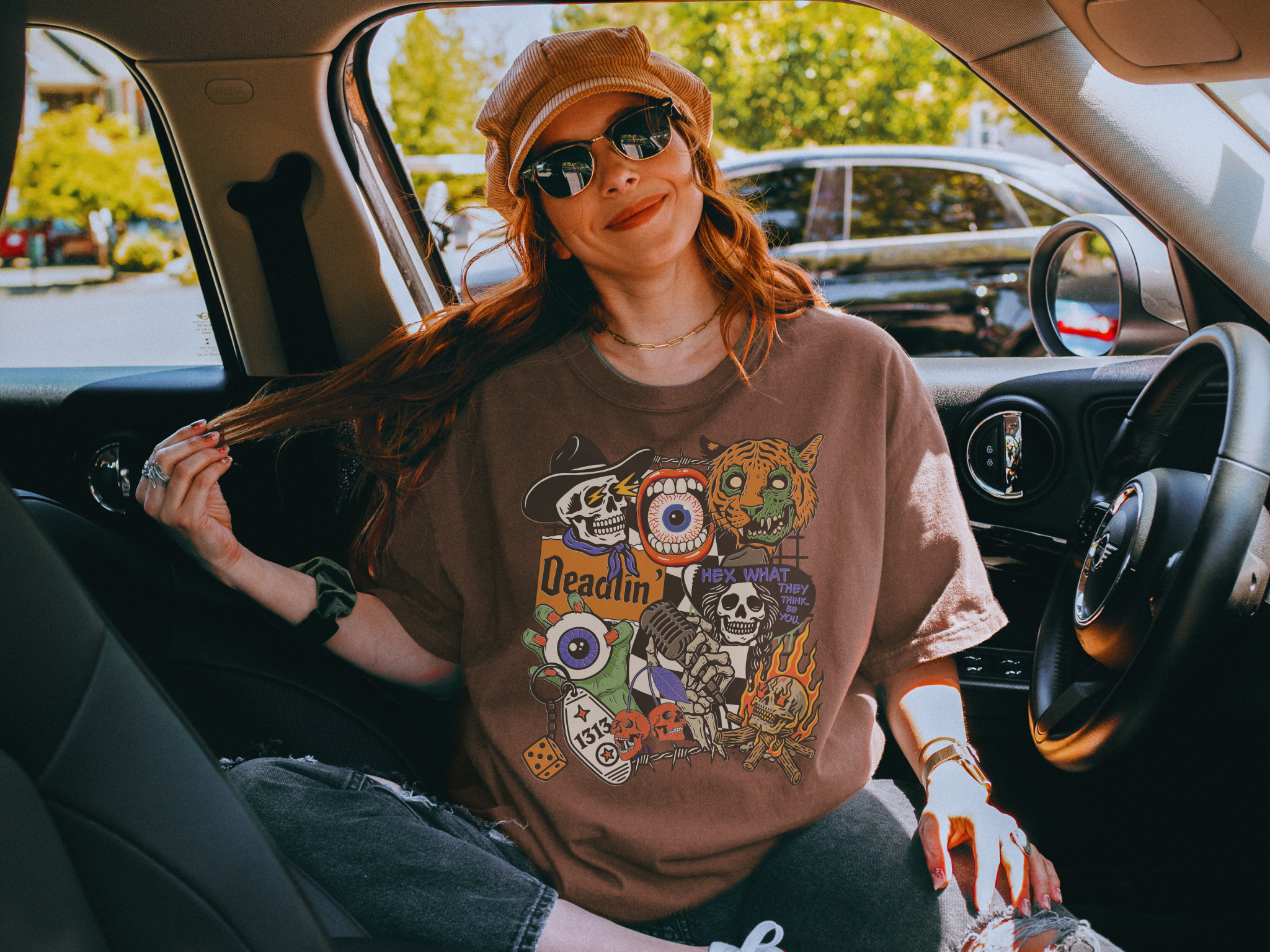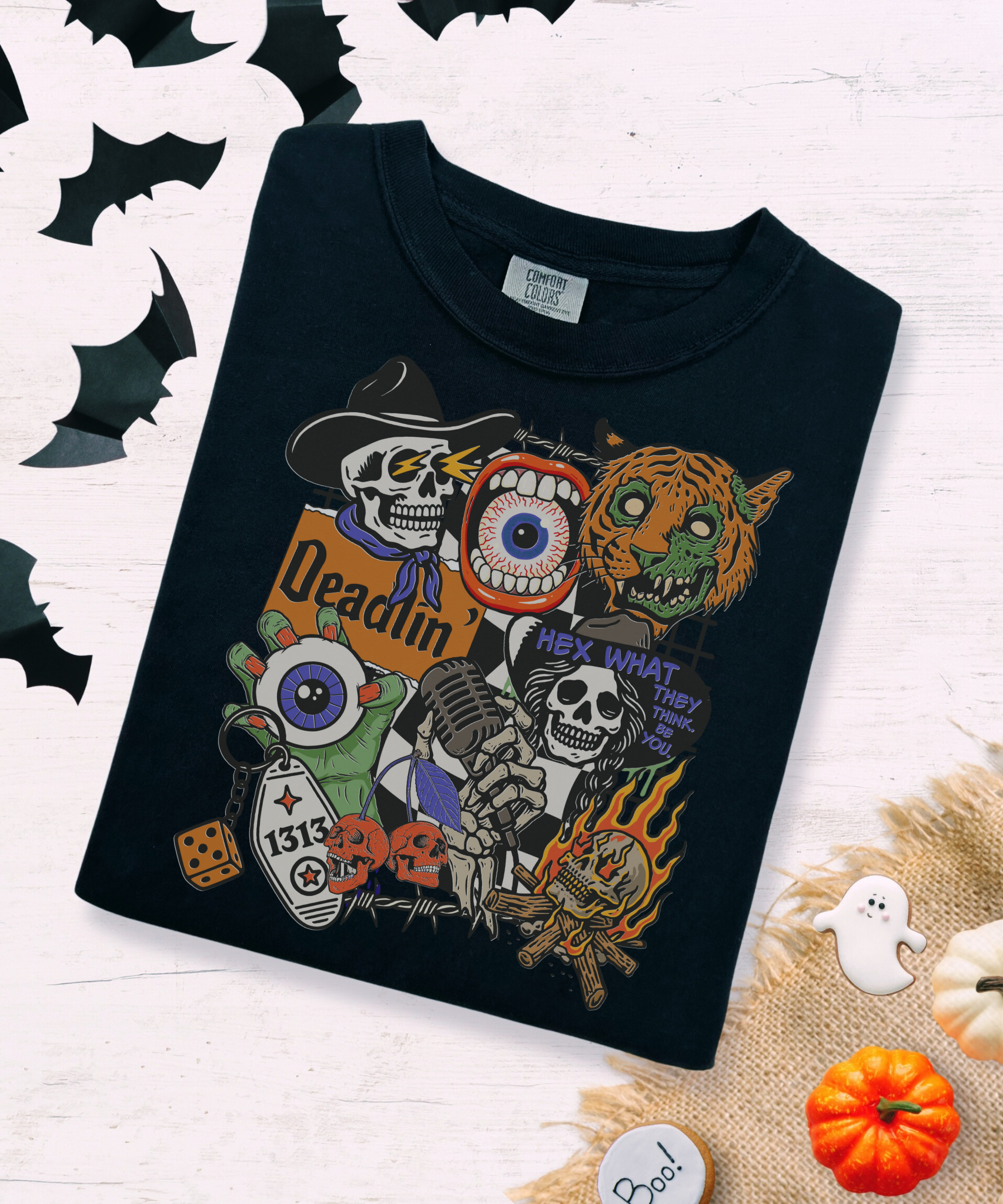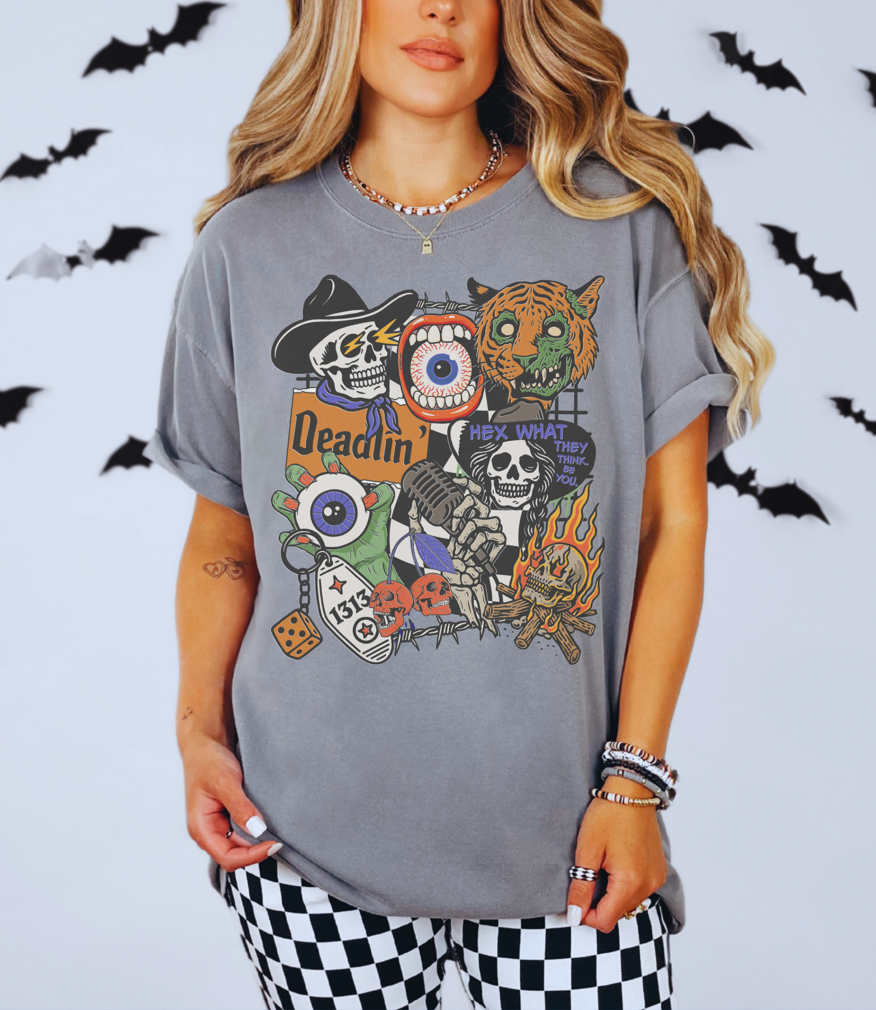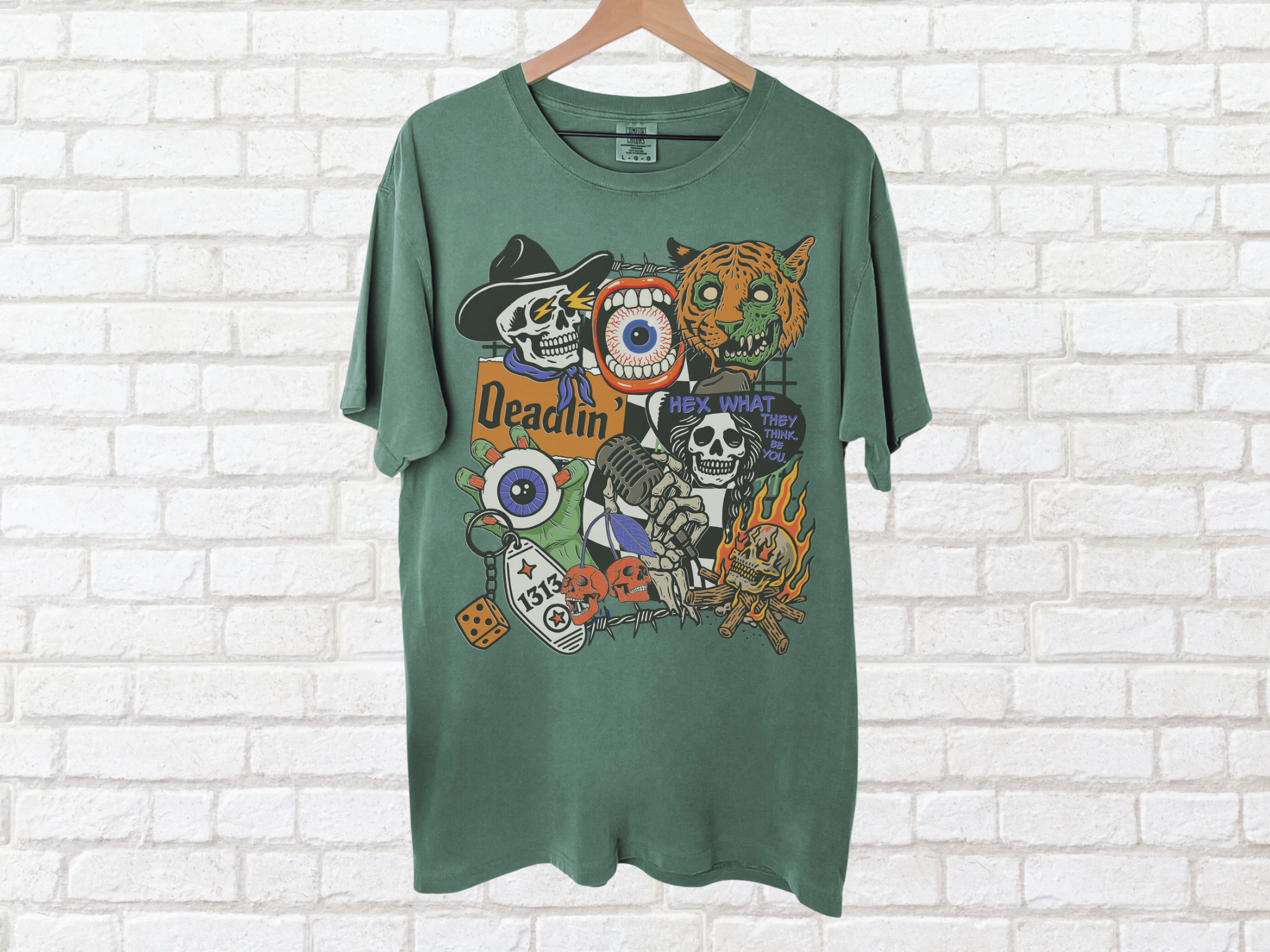 Spooky Retro Halloween Graphic Tee â Witchy Goth T-Shirt with Skeletons, Tiger, Eyeball & Flames | Vintage Horror Aesthetic