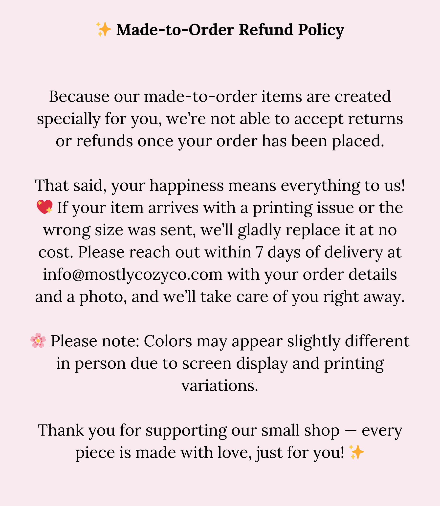 We accept returns or exchanges within 7 days of delivery for items in original, unworn, unwashed condition with tags attached. Final sale items, personalized products, and intimates are not eligible for return.
