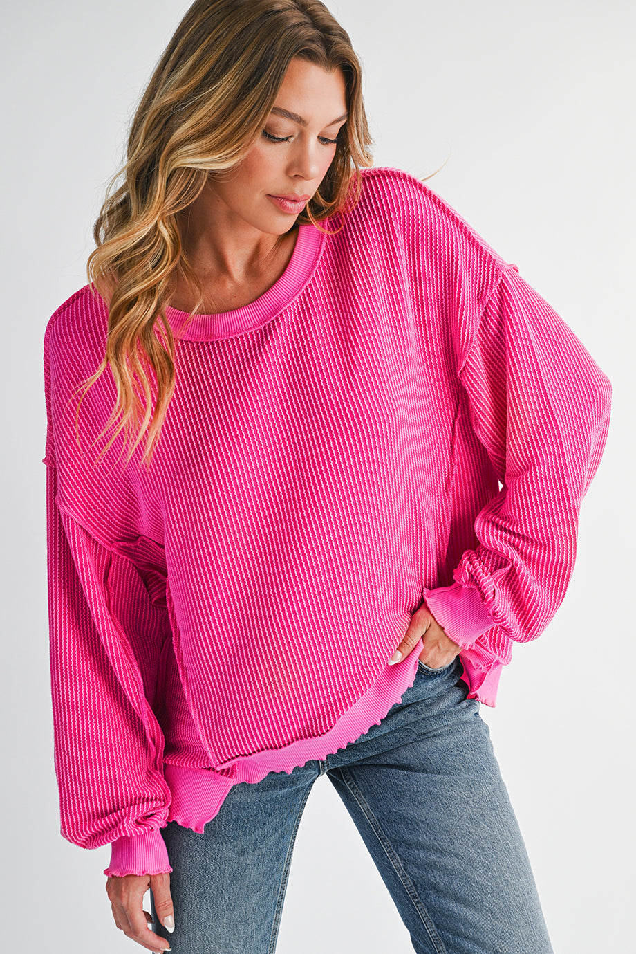 Strawberry Pink Twisted Ribbed Seamed Patchwork Long Sleeve Top
